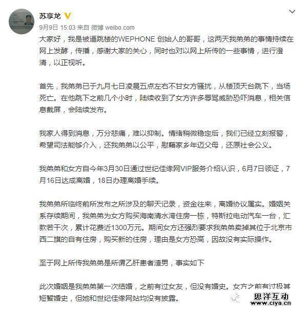 9月8日,有网帖称WePhone开发者苏享茂因被前妻所逼,遭索要1000万元和房产赔偿,后自杀身亡。