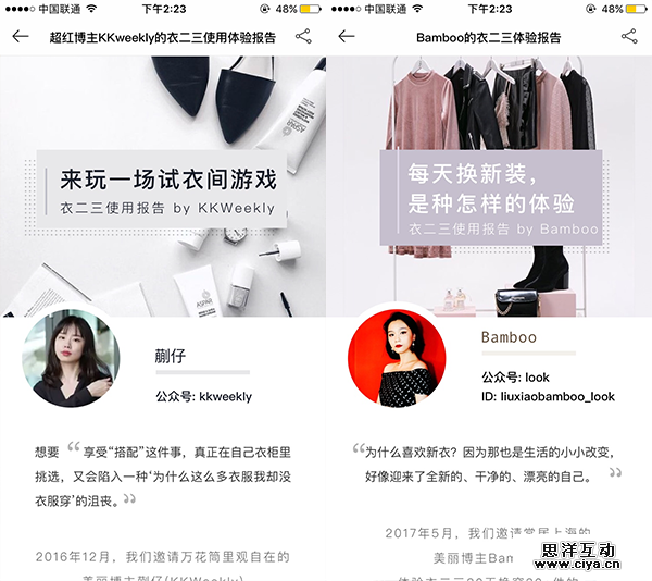 “「超红博主」XXX的衣二三体验报告”主题内容策划,邀请网红博主为平台的衣服做测评,通过展示网红博主的穿搭以及试用报告,并提供对应的商品页面。仿佛在对用户说着,如果你想穿得和网红博主一样美美的,可以来使用我们的共享衣服。
