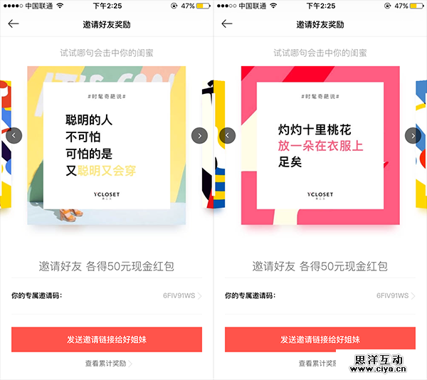 用户邀请自己的好友注册,两人都可以获得50元现金红包。衣二三APP通过派发邀请奖励的方式,刺激用户对自己的朋友进行邀请,为APP拉来了新的用户。