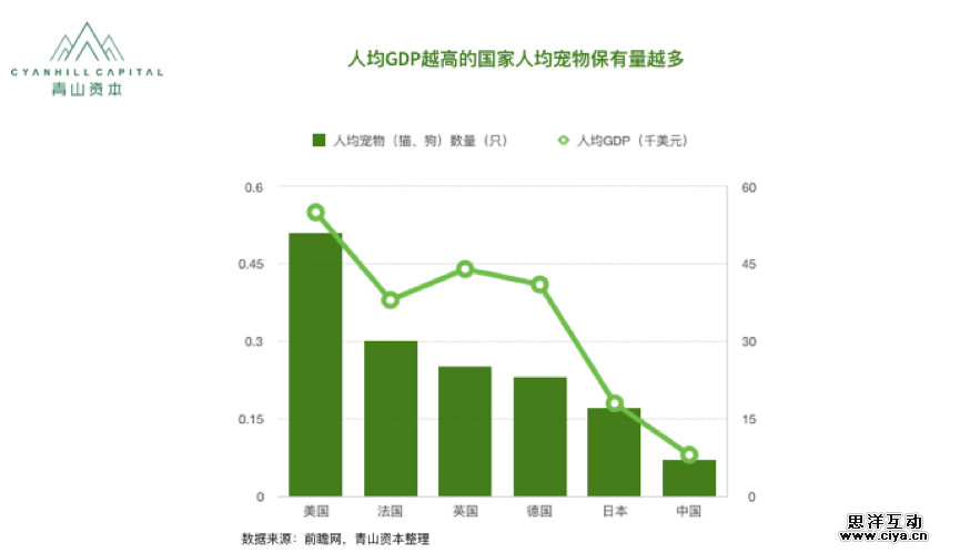 根据过往对标市场的研究,宠物行业发展的一个重要节点是人均GDP达到8000美元,人均GDP越高的国家,人均保有宠物量也更多。截止2016年,中国的人均GDP已经超过5万元,已经步入这个宠物行业发展快速发展的节点。