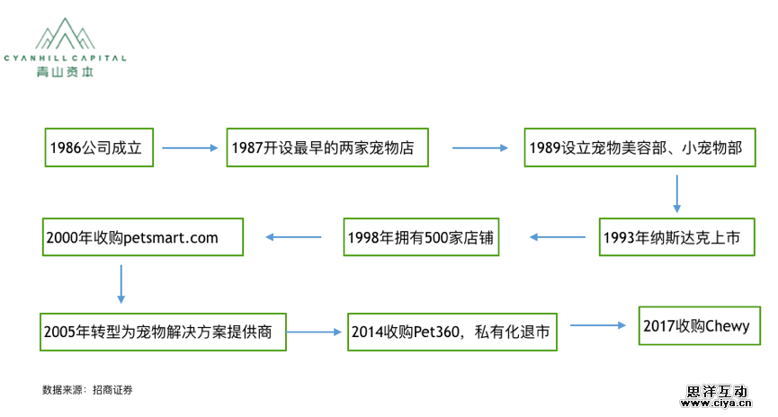 PetSmart以宠物食品起家,后续顺应宠物的消费升级,转型为宠物服务上,提高盈利能力,增强用户粘性,之后又收购Pet360和Chewy,布局线上渠道。