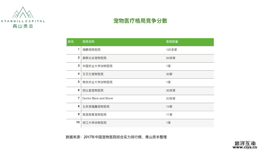 目前宠物医疗行业的竞争格局分散,行业龙头企业瑞鹏门店数量占比仅为1.2%,收入占比不足1%;行业客户满意度排名前10的医院规模总和占总市场规模比例不足3%。在宠物医疗领域存在着比较大的后期资本整合机会,早期进入门槛相对比较高。