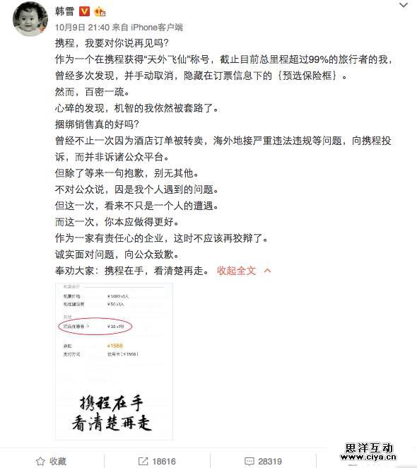10 月 9 日 21 点 40 分,中国内地女演员、歌手韩雪微博发表动态怒斥携程,称自己曾经多次发现并手动取消隐藏在订票信息下的“预选保险框”,但是“仍被套路”,且向携程多次投诉未果。在这条微博最后,韩雪要求携程诚实面对问题,向公众致歉,并奉劝“携程在手,看清楚再走。”