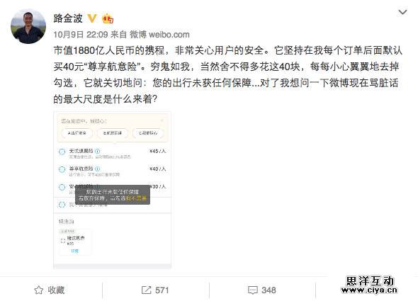 同日 22 点 09 分,果麦文化传媒董事长路金波也发表了一条微博动态,同样斥责携程在自己的每个订单后面默认购买 40 元“尊贵航意险”的行为。