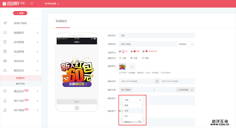 (1)日常活动一般是以抽奖、大转盘、H5游戏为主的活动,用户通过参加活动,获得积分或优惠券奖励。日常活动普遍存在于各个APP中,部分用户也已麻木,若是要提高日常活动的参与率,可以根据用户行为触发对应的活动,比如,用户首次打开APP,即可看到新手注册大礼包,用户只需要注册账户,就能获得这个新手大礼包。日常活动的参与率,其实可以通过技术的手段来提高。活动盒子这一APP活动运营工具,可以根据用户的行为触发对应的活动,以此提高活动的参与率。