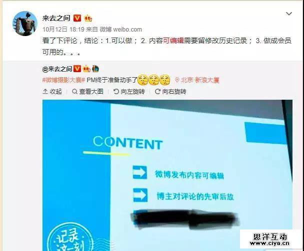 10月12日,新浪微博CEO @来去之间(王高飞)在微博上发布了一张幻灯片图片,图中有两个信息点:1.微博发布内容可编辑;2.博主对评论的先审后放。第三条保密。