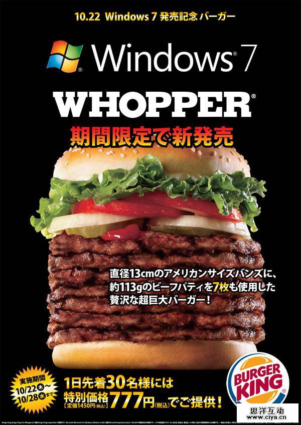 这得从09年win7发布说起了。话说日本汉堡王为了庆祝win7发售而出了款特别款汉堡: