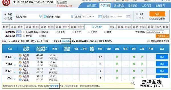 在没有符合出行需求的车票时,您可使用接续换乘功能,查询途中换乘一次的部分列车余票情况。