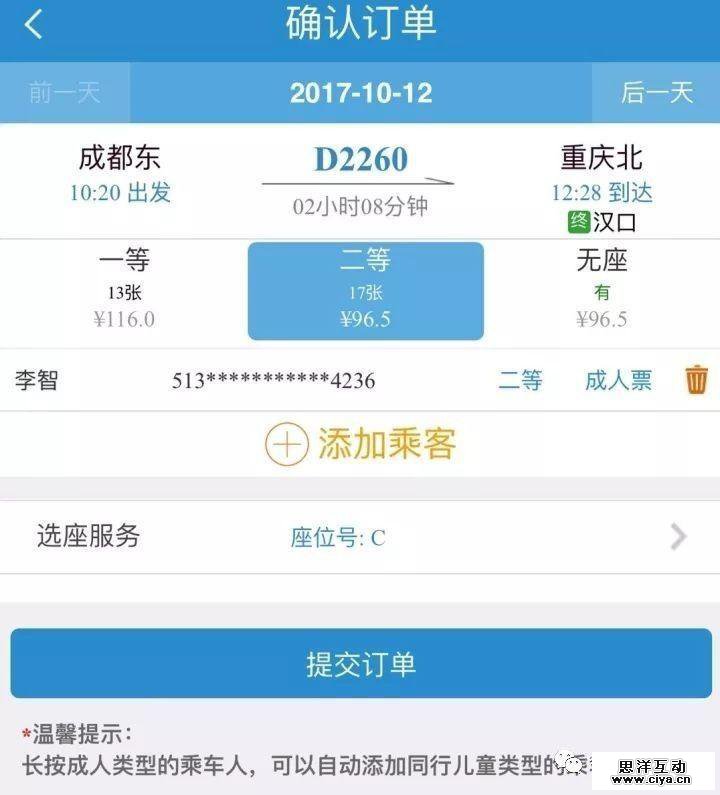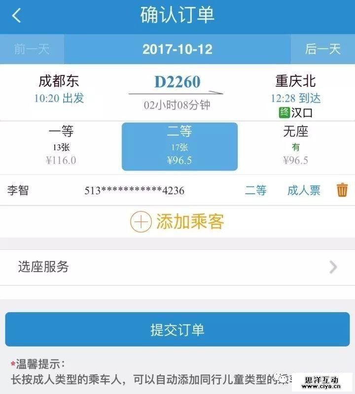 选定合适的车次后,点击“预订”系统将再次进行提示,选择对应车次所需席别及对应乘车人等信息后提交订单,后续按系统提示完成支付即可。