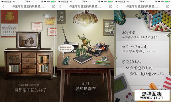 时光隧道这一H5页面,用于帮助用户唤醒童年记忆,童年有父母陪伴我们长大,如今我们陪伴父母变老,重阳节就让我们将父母宠成小孩子,这么一种氛围令用户自发地参加到活动中来。