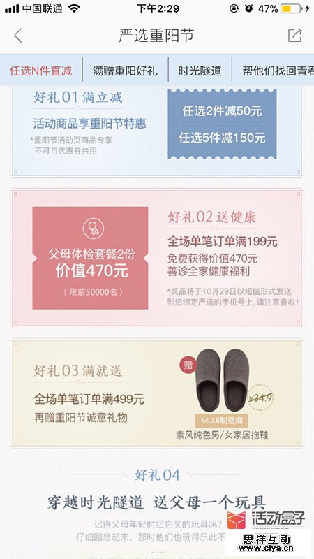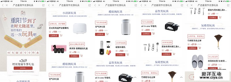 既然电商APP的节日活动营销,必然会有商品促销信息,只不过在重阳节的时候,商品促销会与节日有相关。网易严选APP的时光隧道板块,为用户提供了玩具主题的商品,通过上边的H5页面,将用户引导到商品促销页面,促进商品的购买转化。