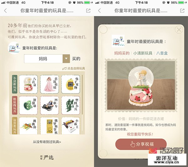你童年时,最喜欢的玩具是什么呢?网易严选APP为用户提供了选择,用户可以选择孩提时最喜欢的玩具,并且把它分享出去。