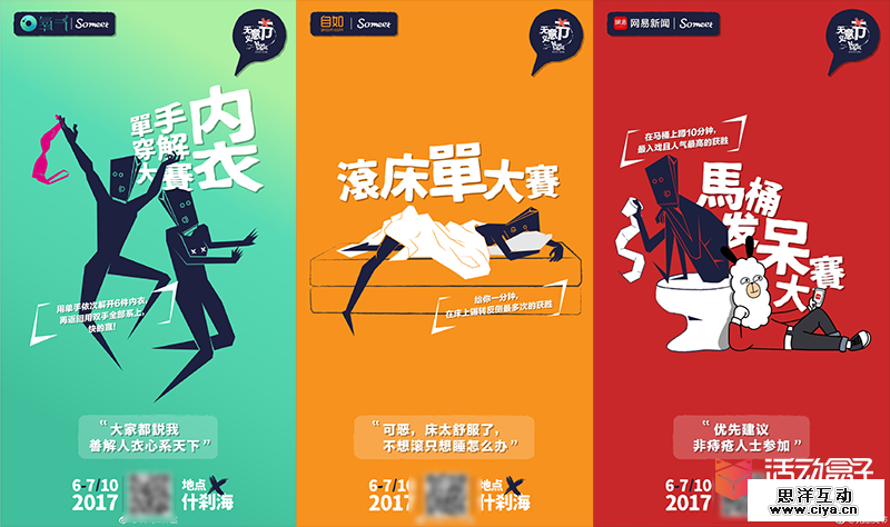 「单手穿解内衣大赛」、「滚床单大赛」、「纸飞机大赛」.....「马桶发呆大赛」这些活动看上去极其没有意义,但这个活动的主题便是“无意义”,恰恰能够吸引到以“丧”自居的用户。