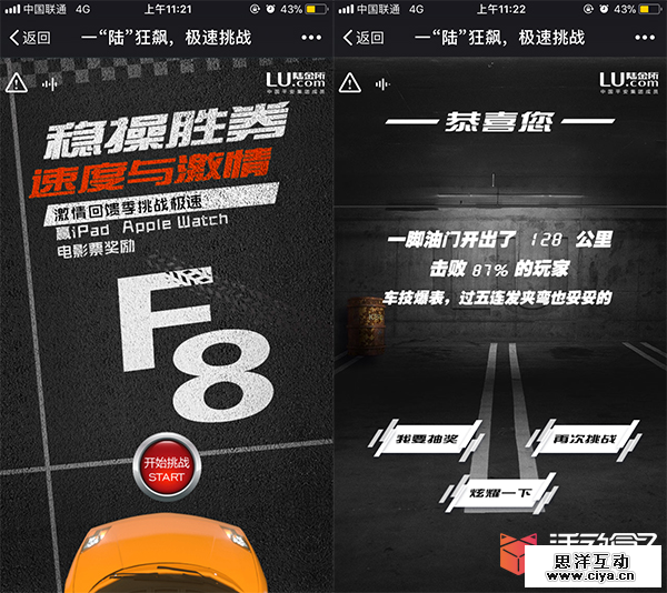 在速度与激情八上映前期,陆金所APP与速度与激情八一同策划了「一“陆”狂飙,急速挑战」活动,用户通过左右倾斜手机来控制赛车前进,不同的关卡难度不同,用户通过反复地玩游戏来突破自己的极限,并且将自己的成就分享出去。