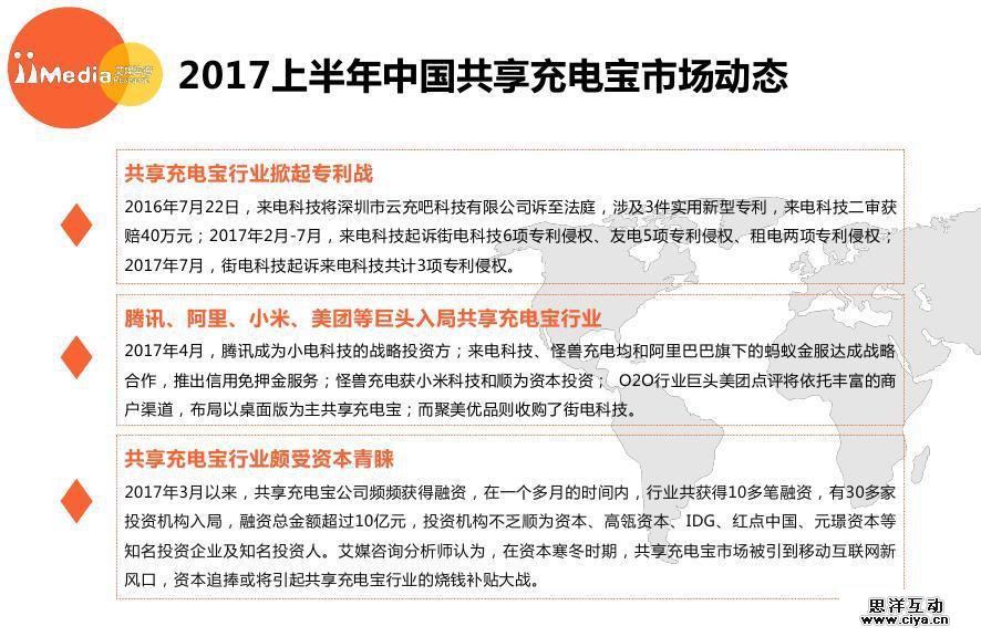 2017年10月30日,艾媒咨询发布《2017上半年中国共享充电宝行业专题研究报告》。报告显示,中国共享充电宝行业获资本青睐,发展迅速,但行业面临的挑战也很明显。艾媒咨询分析师认为,共享充电宝市场获得资本投资后急剧升温,市场竞争格局仍不稳定。当前市场针对共享充电宝业务盈利模式仍抱有保留态度,行业可持续发展能力仍有待市场校验。