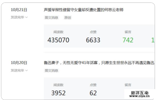 以《声援那个举报性侵留守儿童反遭处置的何思云老师》这篇文章为例,当时在 3000 粉丝的小号创造出43W+阅读,微博更是达到近千万阅读。