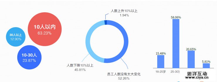 9、多数创业公司的创业规模在十人以内,超过一半企业创业后员工人数没有太大变化,还有将近一半人数下降。只有不到2%的公司人数有较大提升。