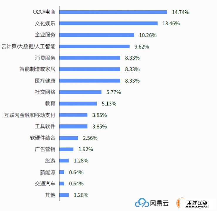 1、2017 年的创业方向更加分散:电商/O2O、文化娱乐依旧是热门行业,企业服务、云计算/大数据/人工智能相关领域开始热门,有增多趋势;
