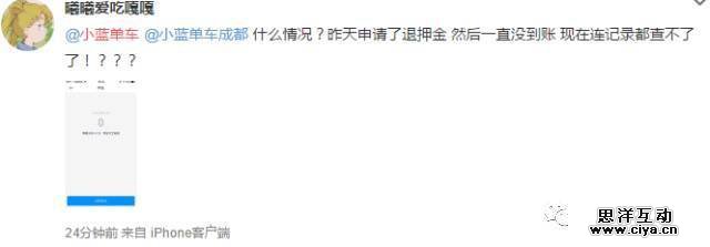 还有用户称,小蓝单车APP中的退款信息无故消失,“押金”一栏直接从“退款中”变成“未交押金”状态,但用户并未得到押金返还。而且这种情况还不是孤例。