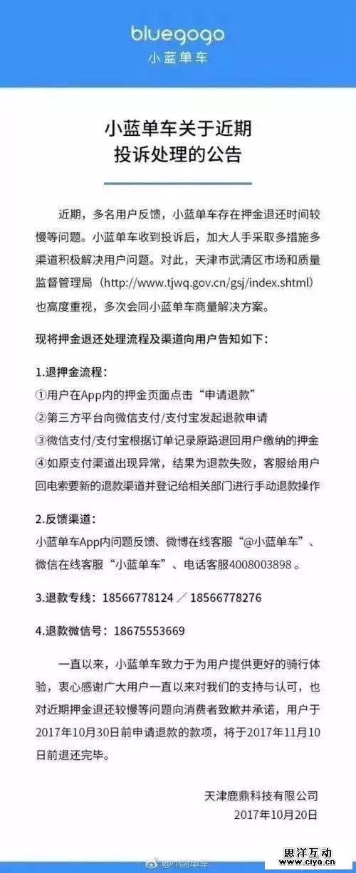 10月20日,小蓝单车曾发布公告称,用户于2017年10月30日之前申请的退款,将于2017年11月10日前退还完毕。
