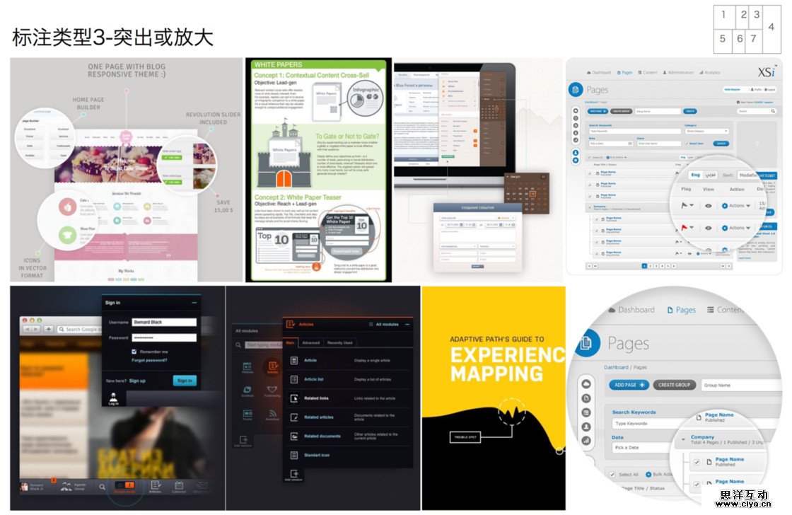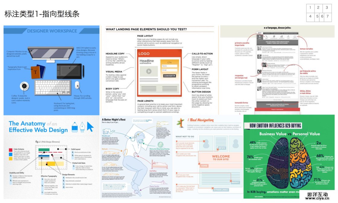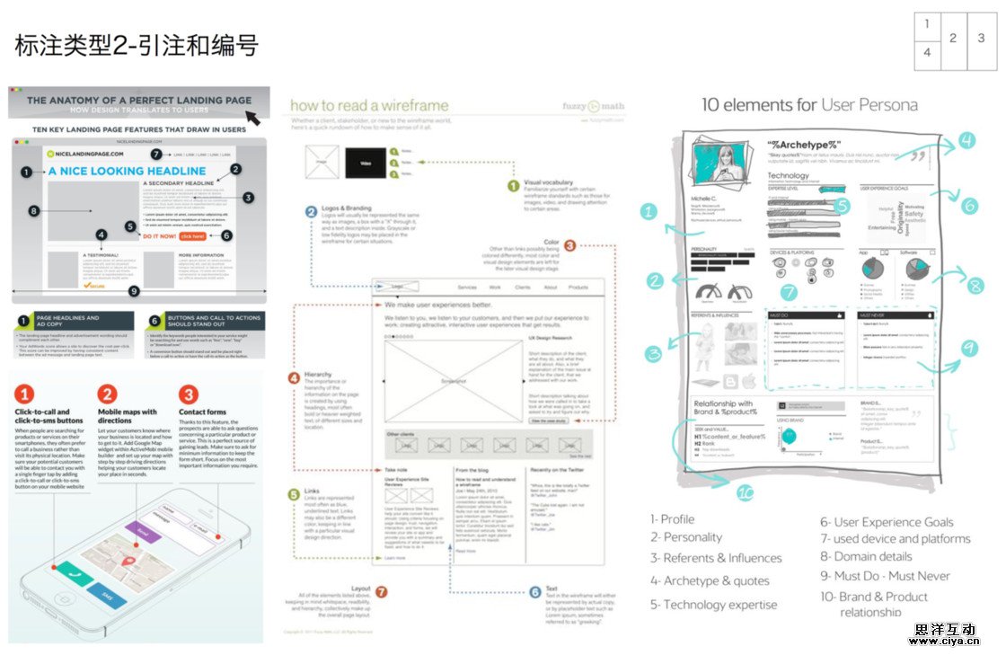 从范例中学习借鉴图示标注是一个比较有效的方式,结合不同的场景和需求,这里将标注分为五种基本模式来介绍:指向线条、编号、便签、突出和放大、场景。