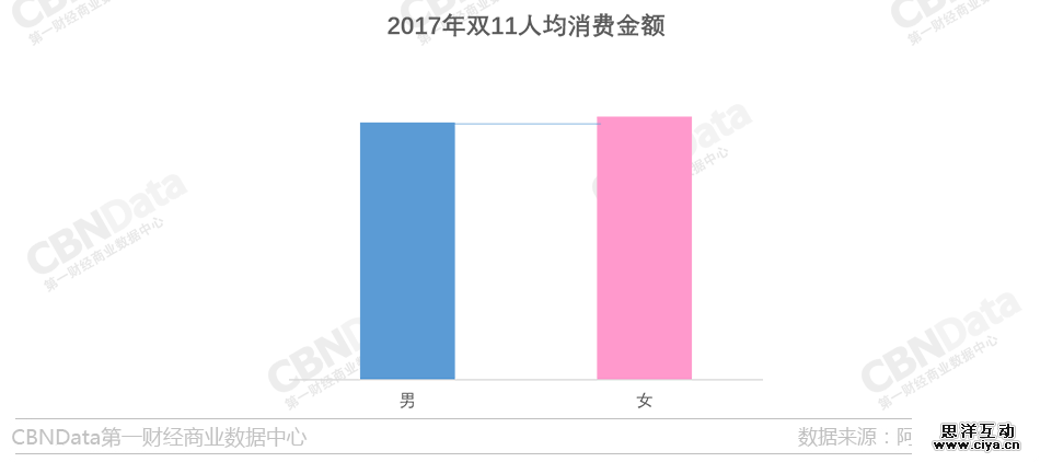 数学委员提取了今年双11的人均消费额数据,发现妹子虽然以微弱的优势领先,但是和汉子的差距还不到一杯星巴克的钱。在下图中可以看到,这杯星巴克的钱,对于双方的整体人均金额来说,根本不算什么。