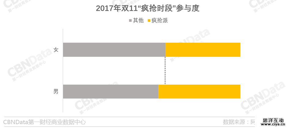 下图说明的是男性和女性消费者在双11抢货的劲头。每年11月11日的前两个小时,是狂欢节里的“疯抢”时段,许多爆款在这个时间段会被抢购一空。