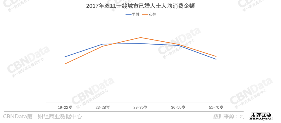在29-35岁的育龄阶段,很多已婚女性都成为了麻麻,而且上有老下有小,承担了较多的家庭采购任务,因此和同年龄段已婚男性的差距最大。