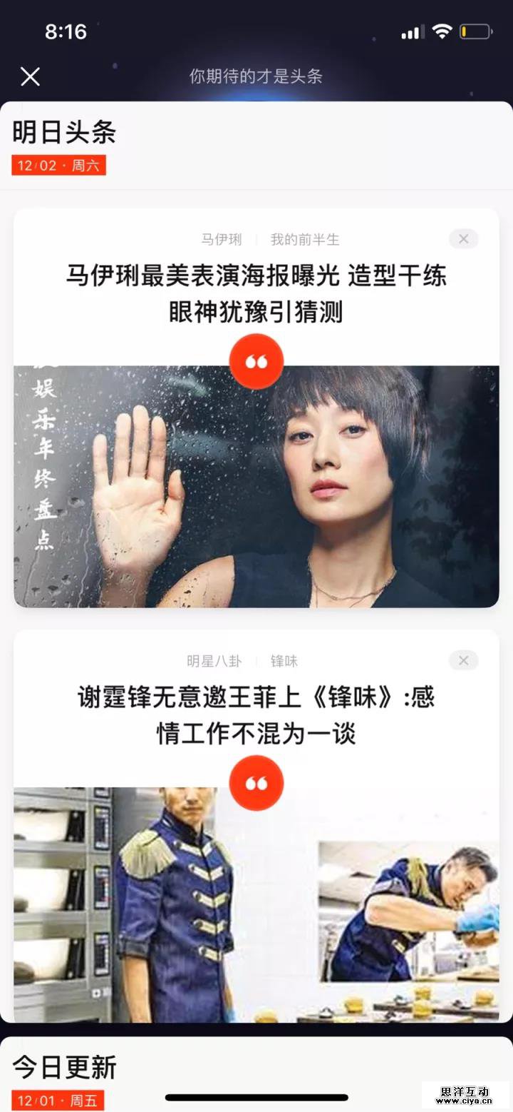 那既然明日头条是提前发布未来将会发生的事情,这就很容易让人得出结论:明日头条不过就是一个每篇不超过 1000 字的新闻“预告”的集合平台。但是实际上,当你点进明日头条的卡片,最下方会浮现出“今日更新”的入口,你曾经在明日头条中阅读的新闻的最新动态都可以在这里查看,即使没有相关信息更新,其也会显示在“今日更新”的信息流中。例如, 11 月 29 日,你查看了“明日头条”中的一则新闻“哈里王子婚礼将于明年 5 月举行”, 11 月 30 日,其就会出现在“今日更新”中,即使并没有婚礼信息,但是与此内容相关的最新消息均会在此呈现。因此,与其说“明日头条”是新闻的预测和预告,倒不如说是今日更新与明日头条协同产生持续性的跟进新闻阅读服务。