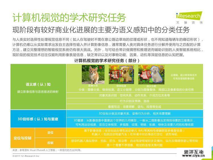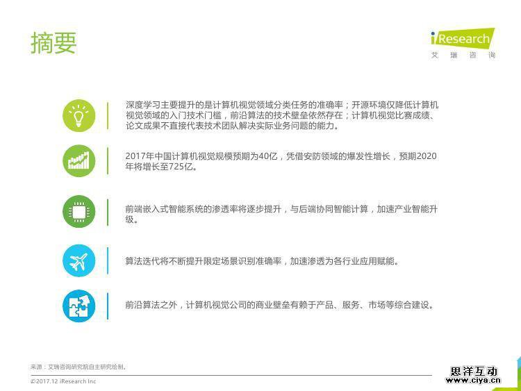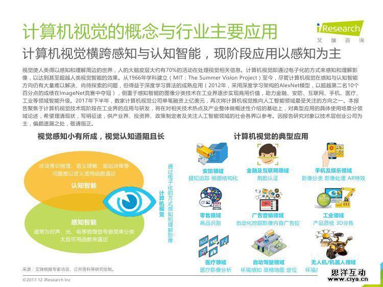 近日,艾瑞咨询发布《2017年中国计算机视觉行业研究报告》,该报告聚焦于计算机视觉技术现阶段在工业界的应用与研发,将在对相关技术热点及产业整体做概述性介绍的基础上,对典型应用的具体使用场景分领域论述(安防、金融、自动驾驶等相对热门的细分领域会附加相关政策、行业痛点、发展思路等较为全面的分析解读),希望理清现状,写明征途,供产业界、投资界、政策制定者及关注人工智能领域的社会各界以参考。因报告研究对象以技术层创业公司为主,偏颇遗漏之处,敬请指正。