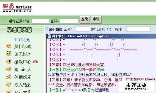 那时足不出户,就可以和天南海北的人海阔天空,那时,网游还没有兴起,聊天室GG、MM、886、大虾等新词不断冒出高峰时候,网易聊天室有7.5万同时在线,直到2008年,网易才停止了聊天室的运营。
