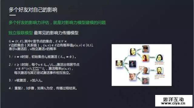 传统的影响力模型有许多种,这里我列了最为常见的独立级联模型。它的原理是这样的,一个用户每个好友都对自己有一个影响力,这个影响力可以用前面我们提到的方法计算出来。初始时刻,已经有一些人是被激活的,这些人就是种子用户,具体的选择我后面会说到。然后,一个用户的每个已经被激活的好友,根据他们之前的影响力去计算一个激活概率,轮流去激活该用户。这样子迭代下去直到每轮没有新激活用户位置。