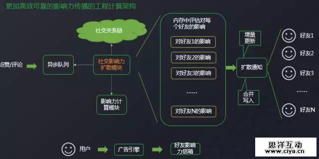 那么这种读扩散的方式不行,我们就换一个思考,采用写扩散的方式。当用户的一个点赞评论数据接收到之后,我们放入消息队列之后,然后社交扩散模块取出,根据关系链,权威度,传播力在内存中计算他对每个好友的影响,然后再告知所有好友这个信息。但是,假如是一一告知,5000 个好友就要 5000 次网络调用,这个开销也是接受不了的。所以,我们会根据路由规则和机器列表,将属于一台机器的用户合并起来写入,最小化网络调用。