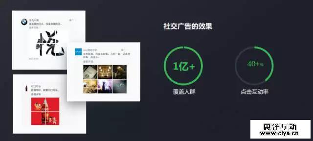 社交广告的效果,如下图右边所显示的第一个数字,其首次覆盖人群超过一亿;而第二个数字,点击互动率已超过 40%,40% 是极高的点击率,能产生这样的效果,广告的社交属性功不可没。