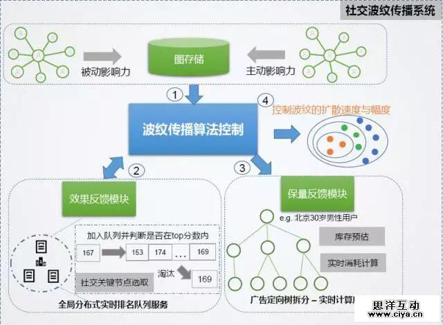 在这两个背景之后,还需要面临具体如何扩散的问题,比如扩散的比例值如何确定;另外,一般品牌广告主也需要合约保量,在保量需求下完成社交扩散动作,这对系统实时性与算法都有很高要求。下面的图中列举了波纹传播系统的几个组成。