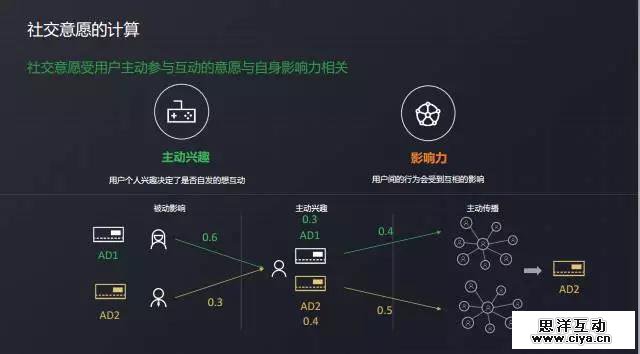 用户的社交意愿,除了受个人主动的互动兴趣外,还受好友的影响。可以看下图下面影响力作用的几个阶段。首先,最中间,用户对两个广告有一个主动兴趣,这是不受其他人影响的。左边,有两个好友分别对两个广告进行了互动,他们与该用户的影响力都是不同的。右边,是一个传播的过程,表示假如我收到广告后,我的互动可能对其他人造成的影响。