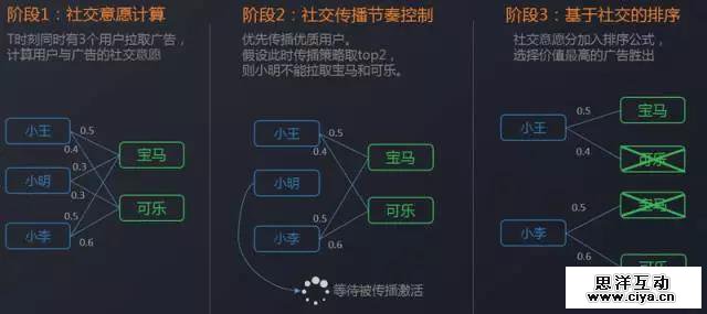 第二个阶段,社交传播节奏控制,它是广告选人阶段,假如这个时刻是让三个人中最好那两个人才能收到广告,那么根据分数计算,发现此时小明此时此刻是没办法收到宝马和可乐这两个广告。但这仅仅只代表此时此刻,随着传播范围的扩散,以及小明受到越来越多的好友的影响,他在之后的某个时刻还是可能继续收到广告的。