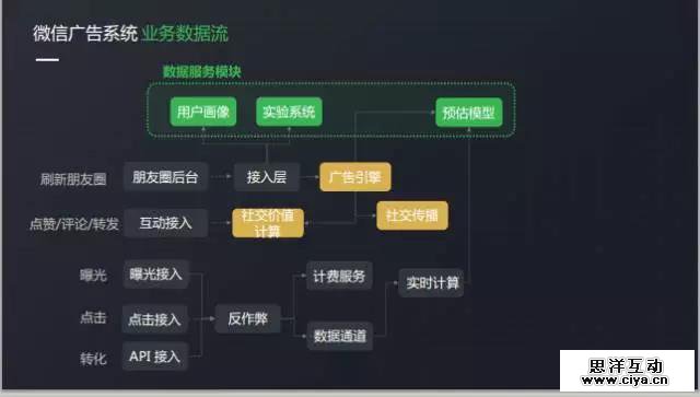 首先,当用户刷朋友圈的时候,朋友圈后台就会把这个请求丢到广告引擎了,广告引擎根据自身的算法和其他数据模块综合计算给出一条合适的广告。引擎算法其中主要还会调用社交传播控制模块,在广告排序之前,先根据社交传播过程动态选定人群。用户拉取到广告之后,会对广告有各种行为,分别是曝光,点击和转化,在经过我们的反作弊模块鉴别之后,就用来计费和更新相关的数据模块。