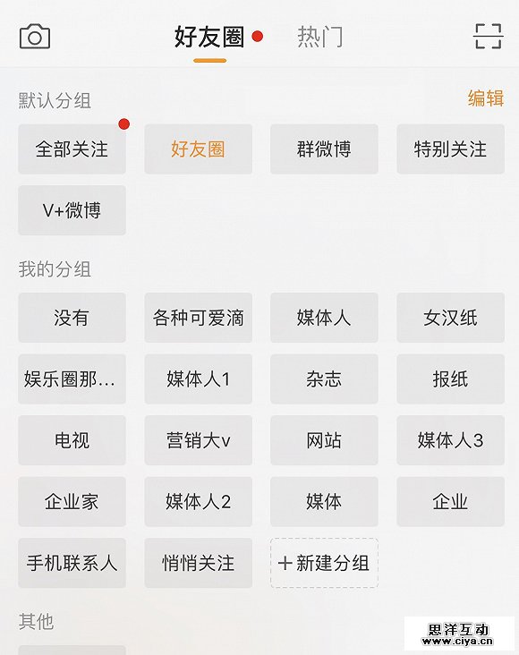 下面这张图是我大学以来使用微博的一个订阅分组。相对来说,媒介素养稍高,也就是很清楚自己要看什么的用户,他的分组本身已经很清晰了,如果要看熟悉朋友的近况,直接点击好友圈,其他内容也不存在被限流的情况。