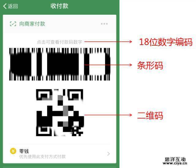 微信付款功能仅适用于消费者向商家付款,由条形码、二维码、18位数字编码三部分组成。