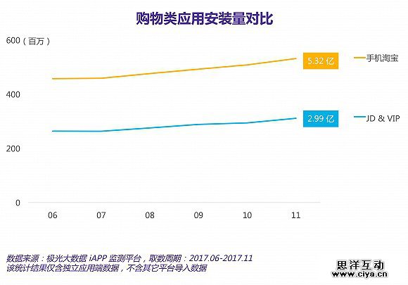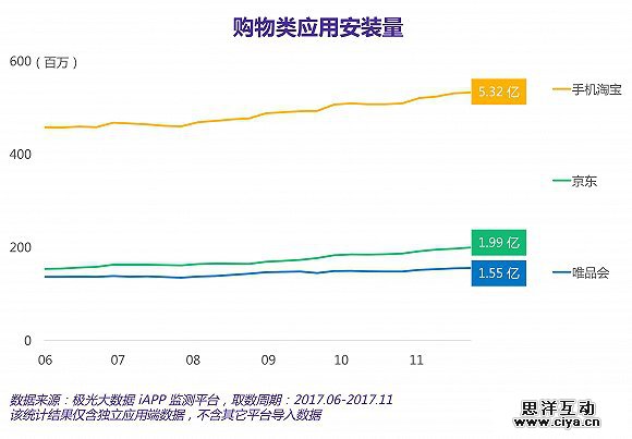 极光大数据的监测结果显示,截至11月最后一周,京东应用端的安装保有量为1.99亿,而唯品会应用端则为1.55亿,在“网络购物”应用中分别排在第二和第四名。在同一时期,手机淘宝的安装保有量高达5.32亿,在同一类别应用中排名第一。