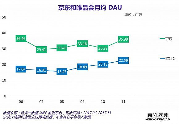 用户活跃度数据显示,京东和唯品会应用端在月均DAU数据上均达到千万量级。在过去半年间,唯品会在月均DAU数据上的增长趋势较为明显,从6月份的1,704万增长至2,259万。在刚过去的11月,京东应用端的月均DAU数量达到3,599万。