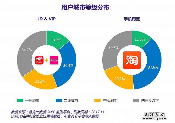 与此同时,京东应用端在一二线城市的用户占比也显著高于唯品会,合共占比达到57.8%。唯品会用户更多分布在三线及以下城市,占比达52.9%。