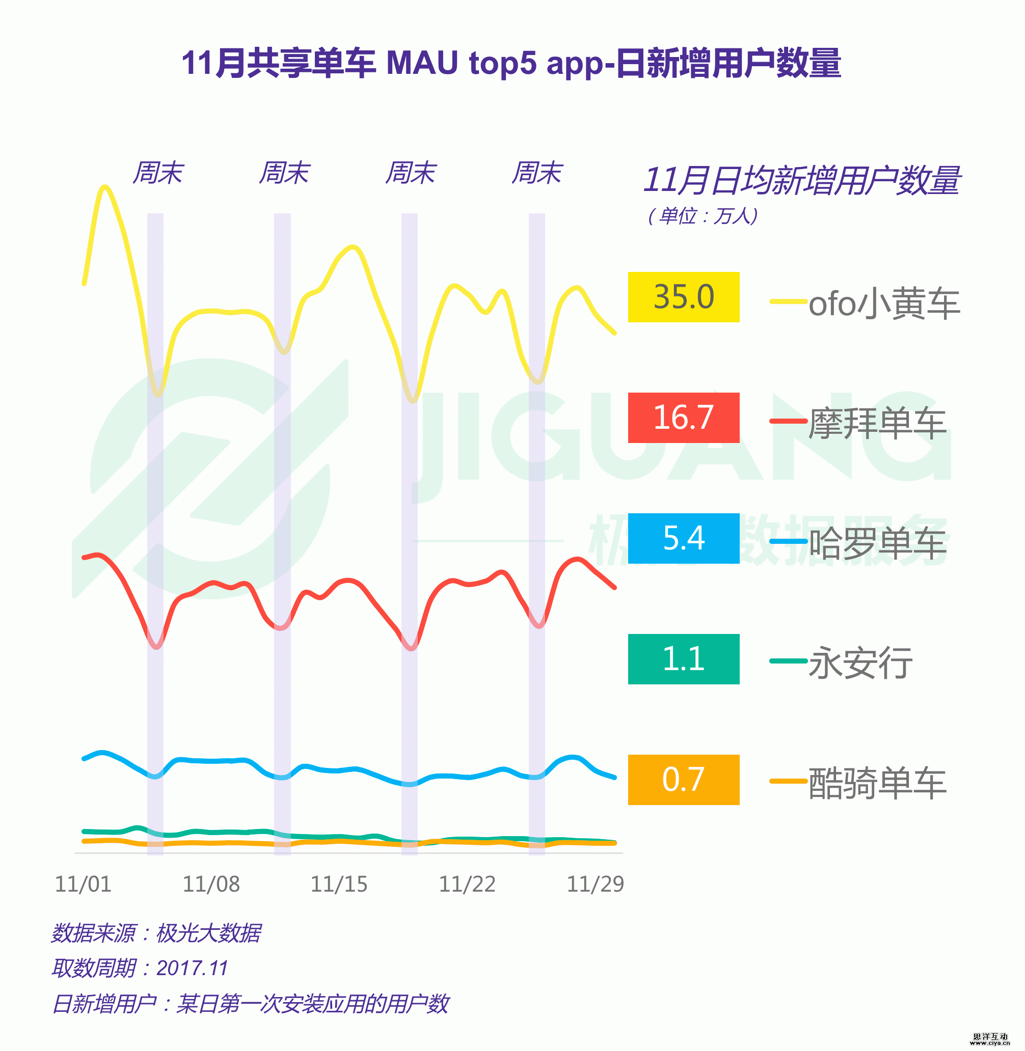 根据极光大数据统计,ofo在11月的日均新增用户数量为35万人,在主流共享单车中遥遥领先