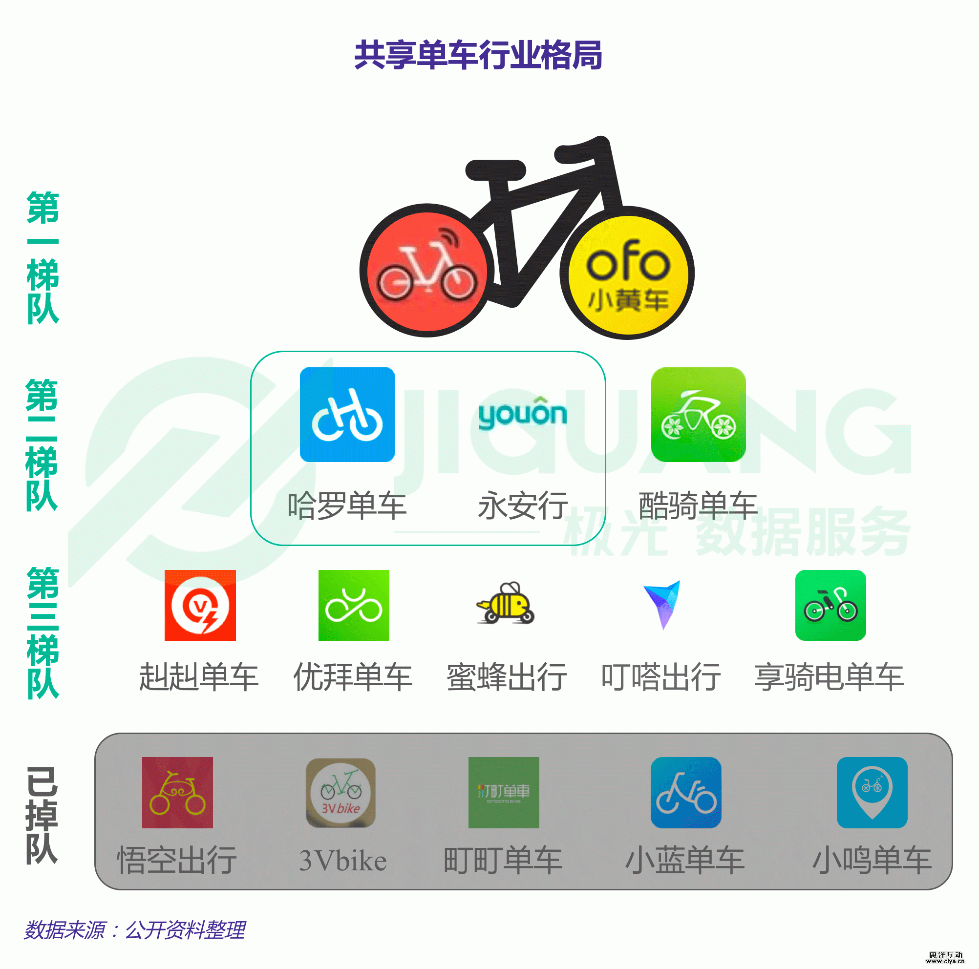 无桩共享单车平台从2015年下旬开始陆续上线,经历了一轮爆发式的扩张和洗牌,目前共享单车呈现ofo和摩拜双寡头的局面,永安行和哈罗单车于今年10月底宣布合并,有望成为业内的一股新兴力量,同样属于第二梯队的酷骑单车则以10亿价格被接手