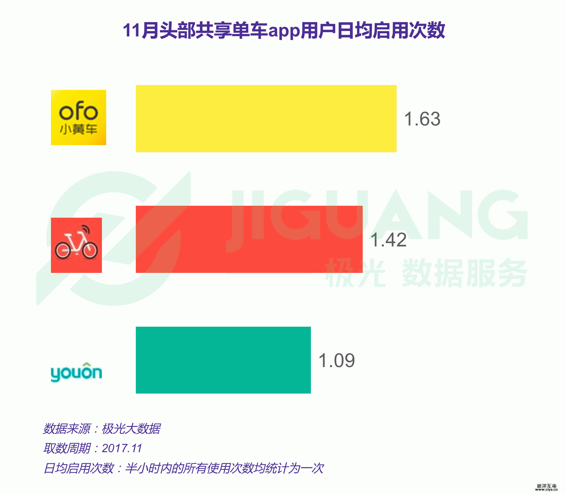 ofo和摩拜的用户日均启用次数分别为1.63次和1.42次