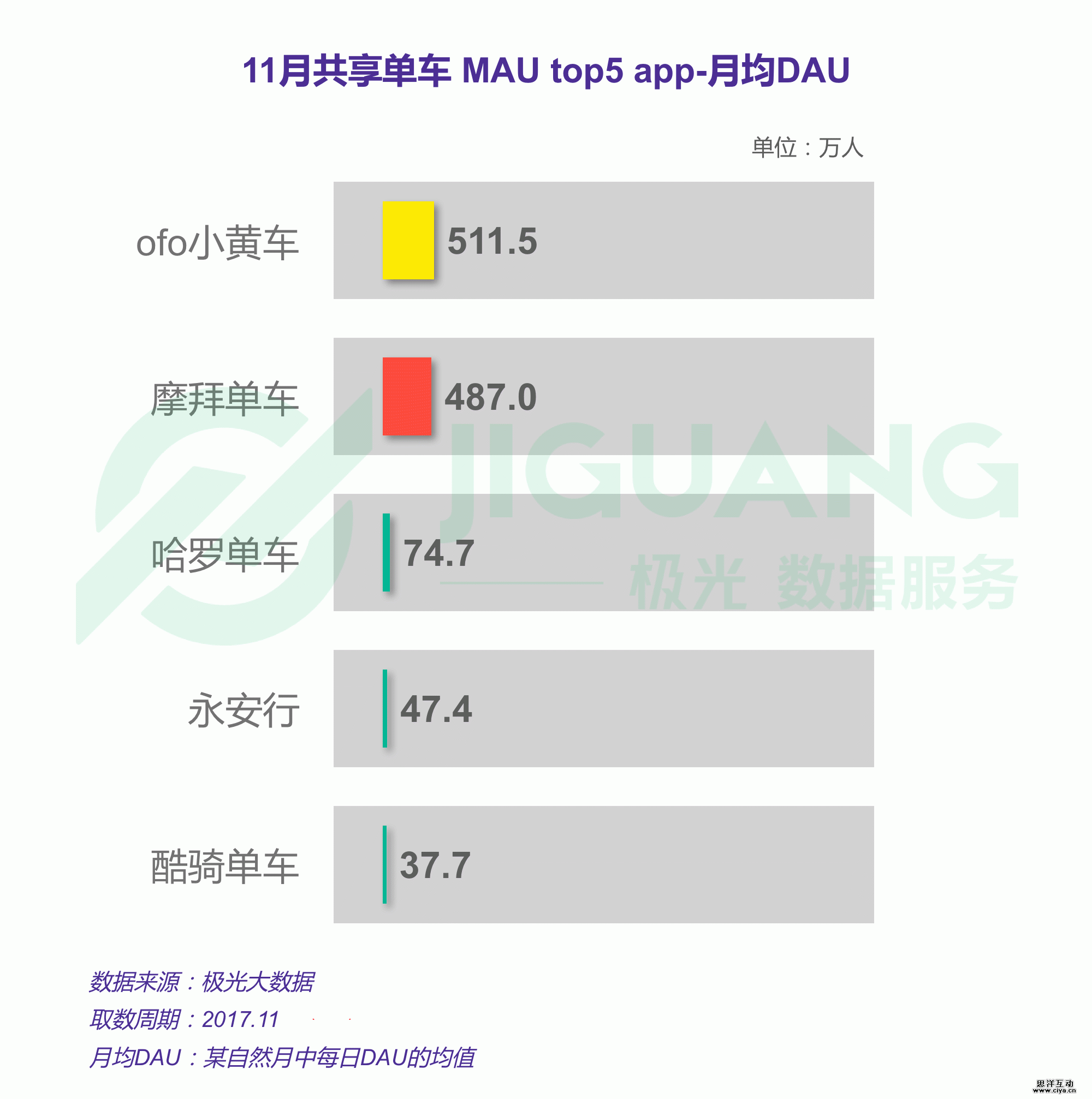 根据极光大数据统计,ofo和摩拜单车的11月月均DAU分别为511.5万人和487.0万人,哈罗单车、永安行和酷骑单车均不足100万人
