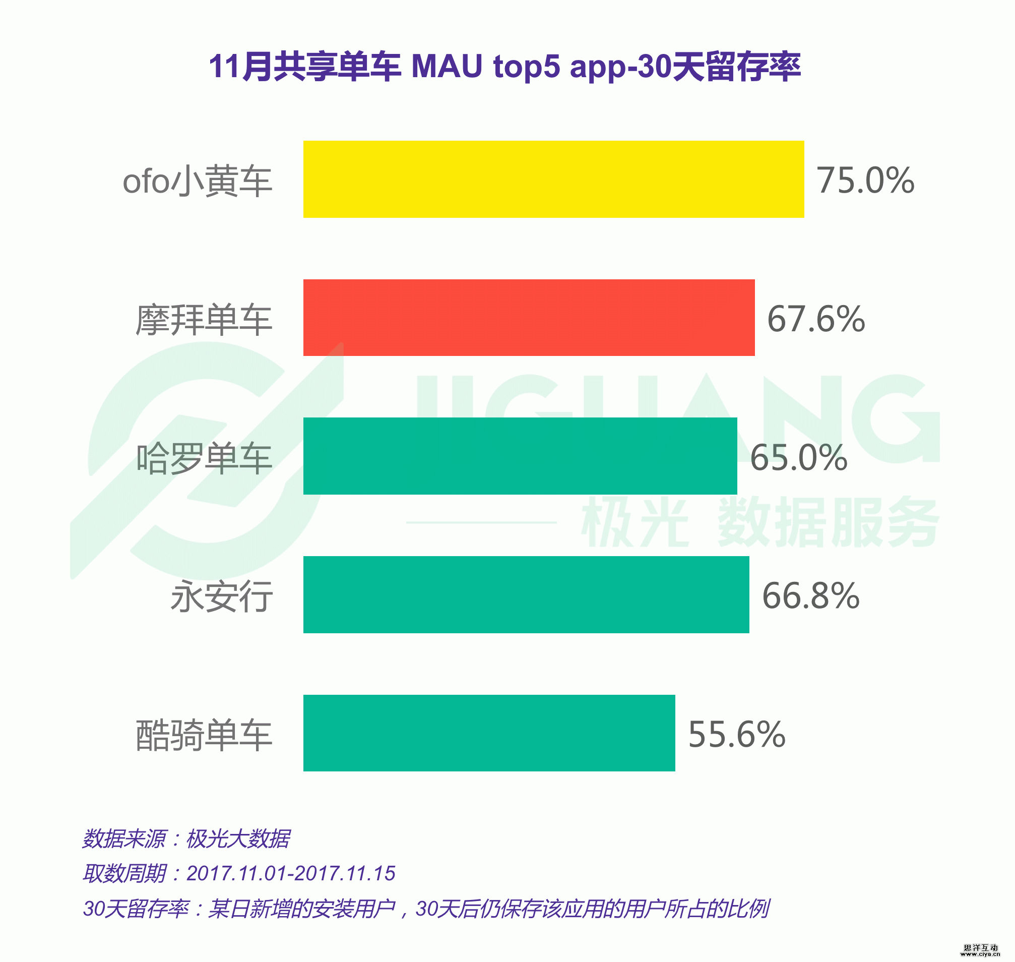 通过观察极光大数据发现,在主流共享单车app中,ofo是唯一一款30天留存率超过70%的app,意味着每100个在11月下载了ofo的新用户中,有75个用户在30天后仍保留了这款app