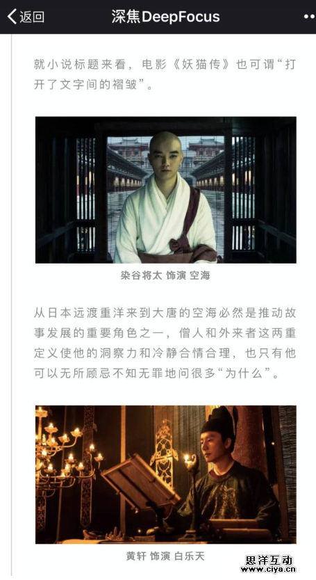 比如“深焦DeepFocus”评论今天刚上映的《妖猫传》,会讲解黑猫如何通过伸腰弓背等肢体语言表达“妖气”,俯拍窥视镜头制造紧张气氛,以及还原场面打造盛世的背后故事等,充满了理性解析。