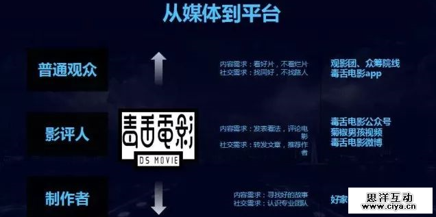 比如他们的作者有“毒sir”、“表妹”、“机叔”、“云舅”、“表叔”等,“毒sir”是主IP,是代表主流大众爱憎分明的男性形象;“表妹”是毒sir的妹妹,倾向于女性端;“机叔”会谈一些艺术大师的电影;“云舅”会从创造角度影响电影从业者那一批人。这样一来,每个看电影的人都能找到自己的代入感。